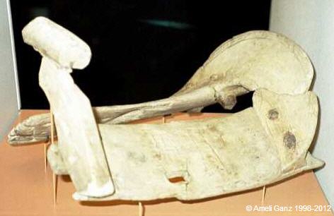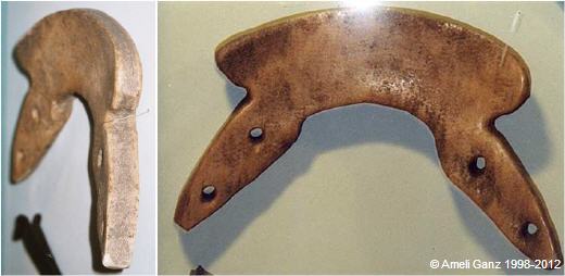 Außerdem lassen sich keinerlei Abnutzungen oder Abrieb feststellen, die genauere Auskunft über die Verkleidung des Elchhornbogens geben. Da alle Ausrüstungsgegenstände der Letten aufwendige Verzierungen aufweisen, diese aber bei dem Sattelbogen fehlen, gehe ich davon aus, daß hier ein Überzug aus Leder oder Stoff wahrscheinlich ist. Die Dimension und Winkelung der Sattelbretter müßte man anhand der Zapflöcher errechnen können.